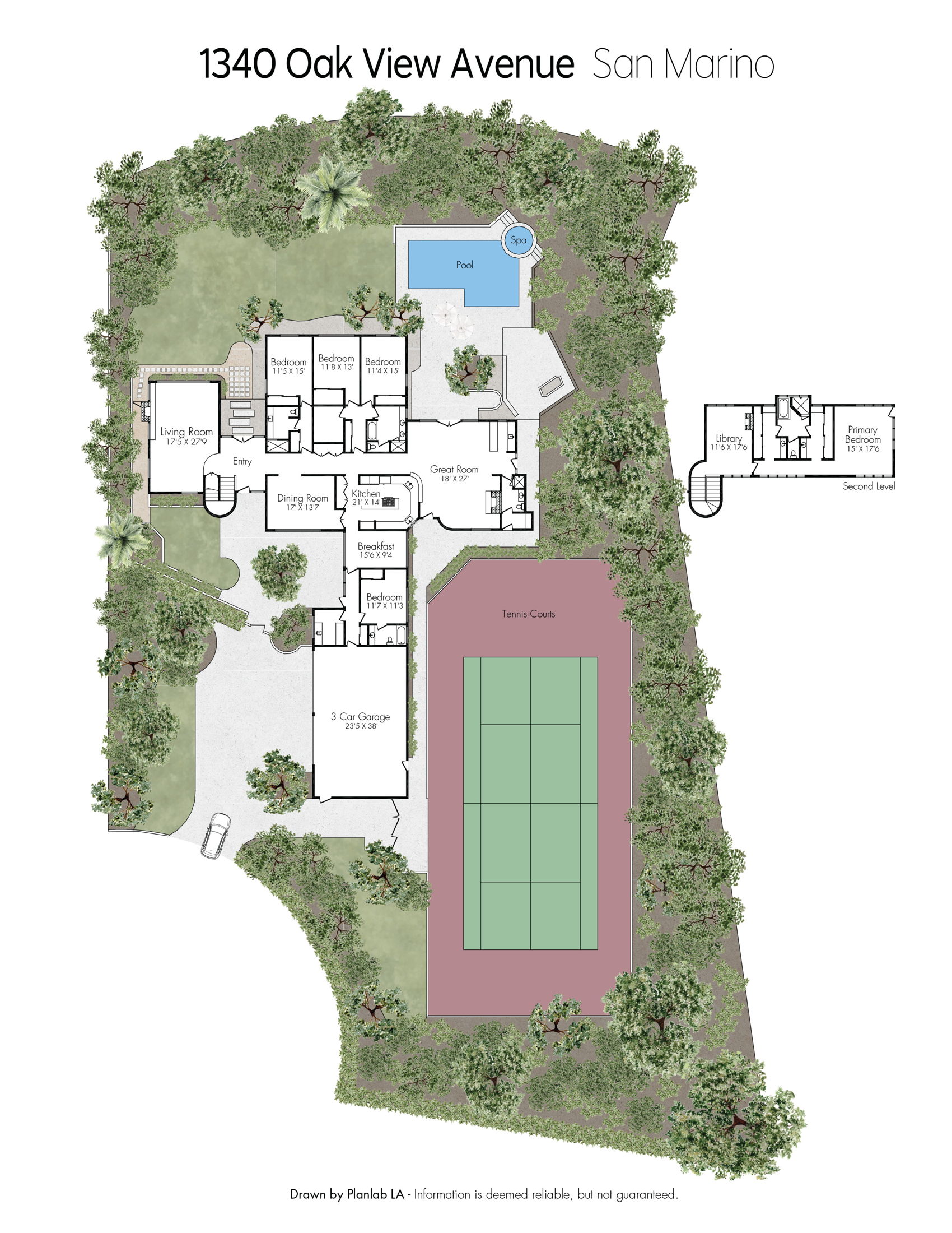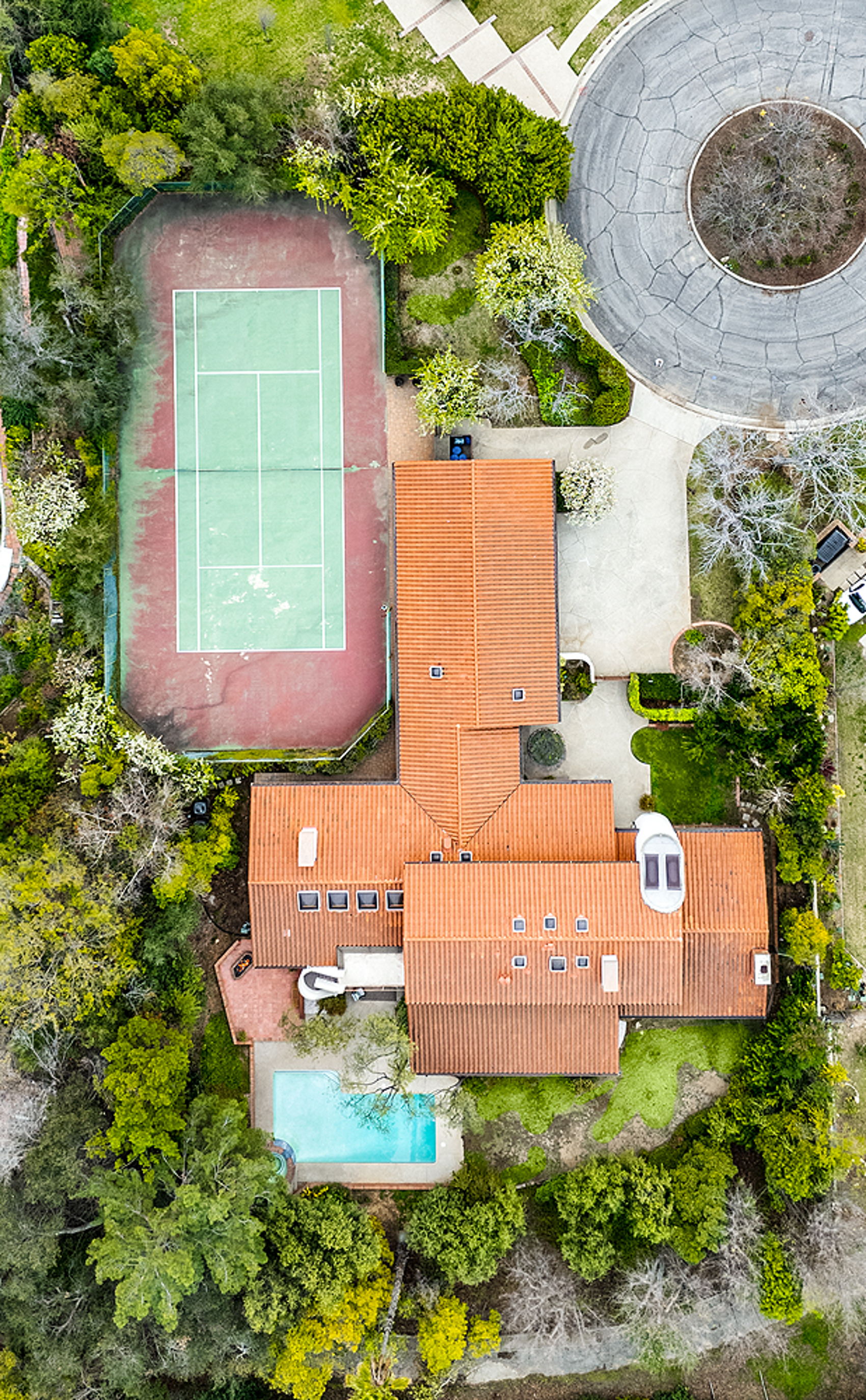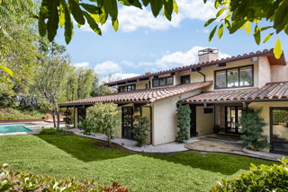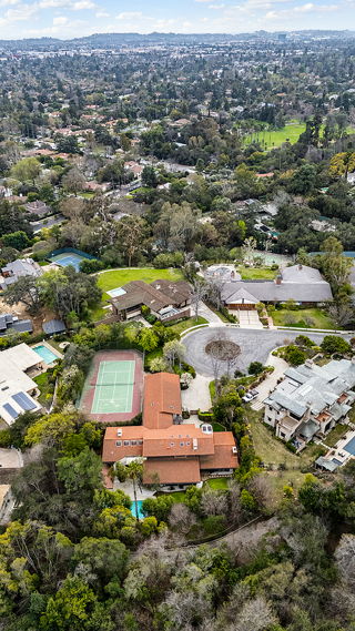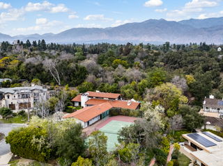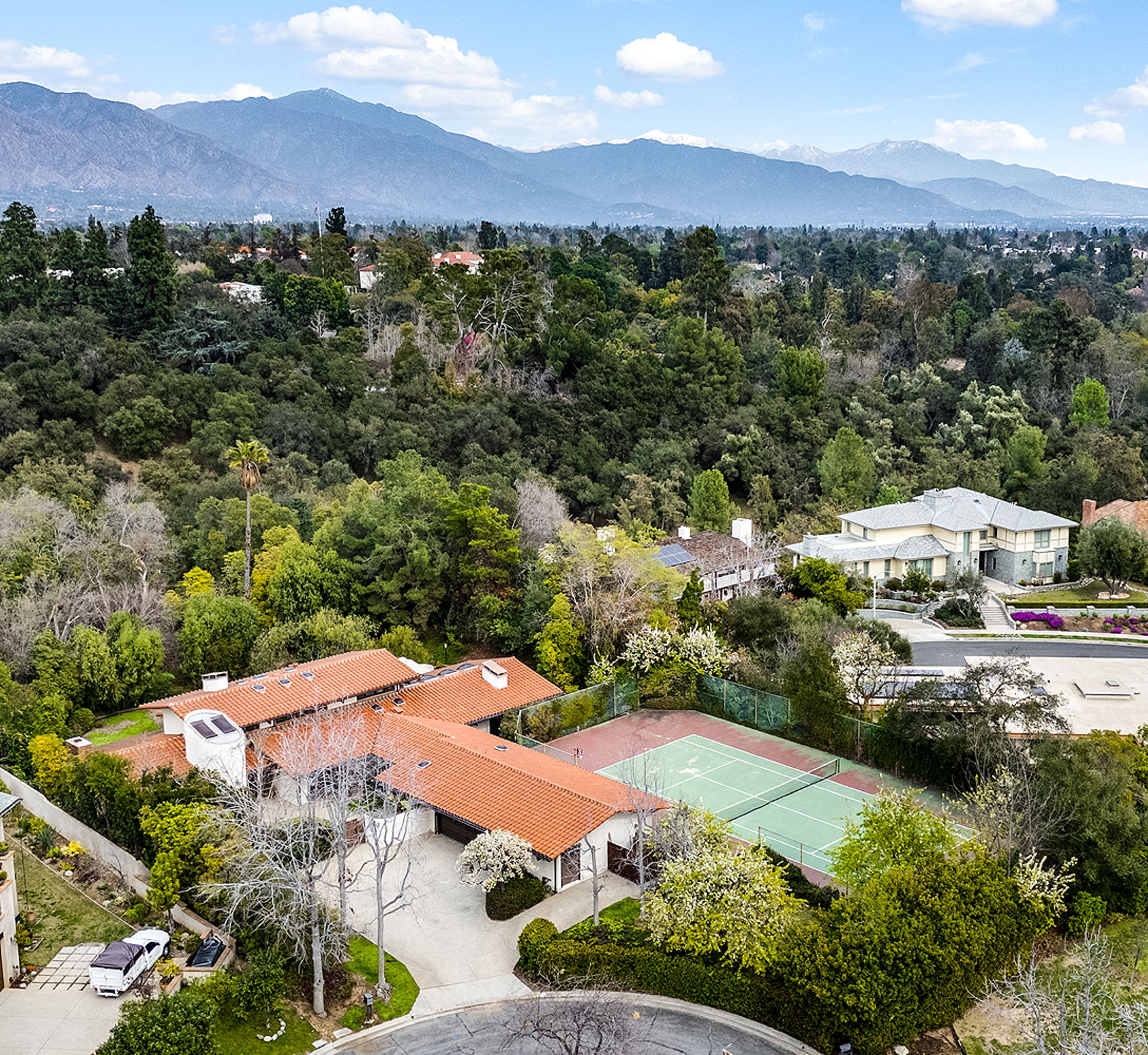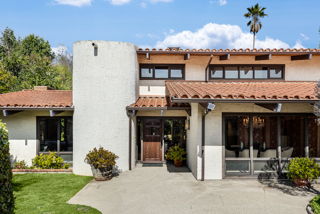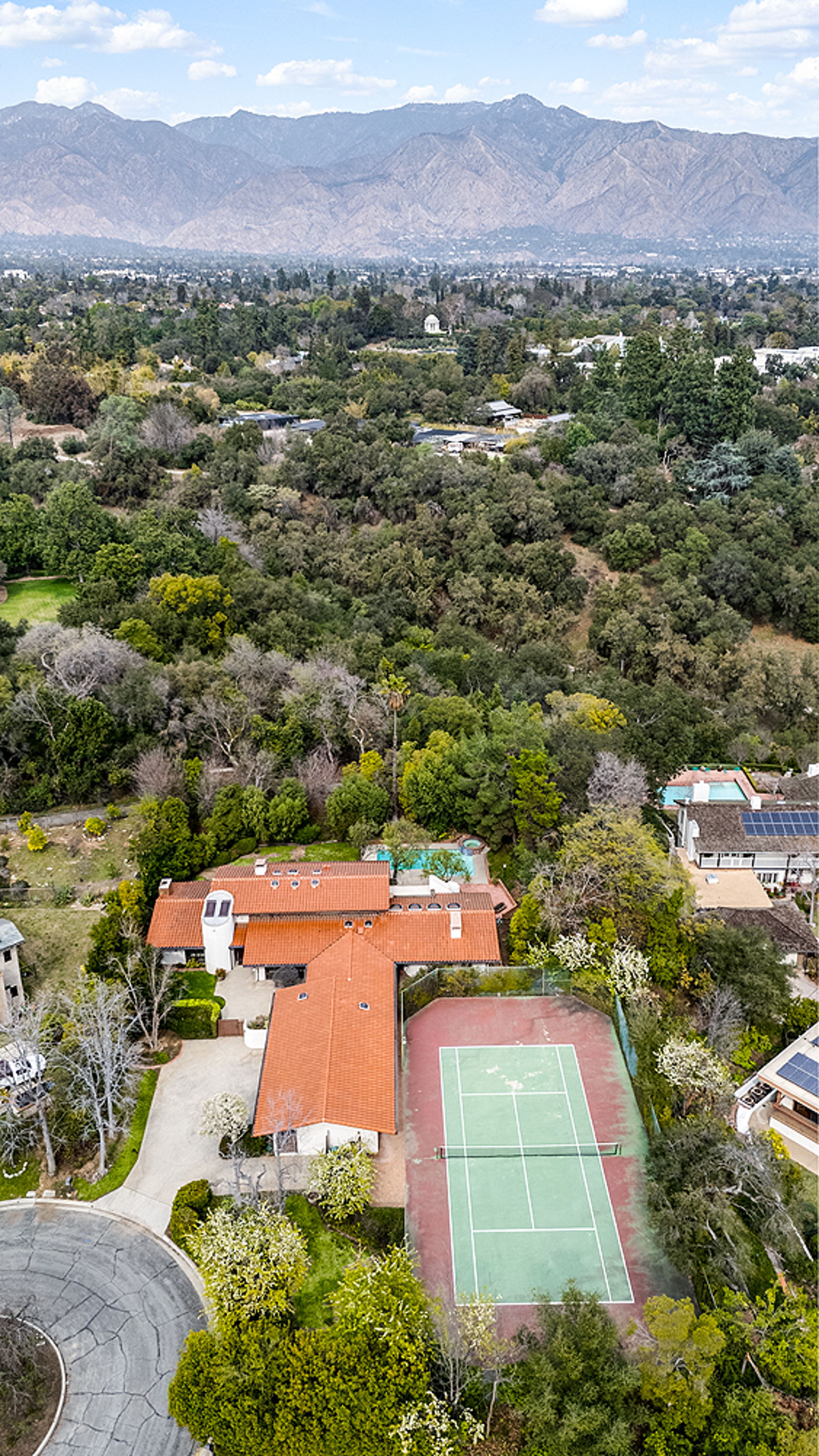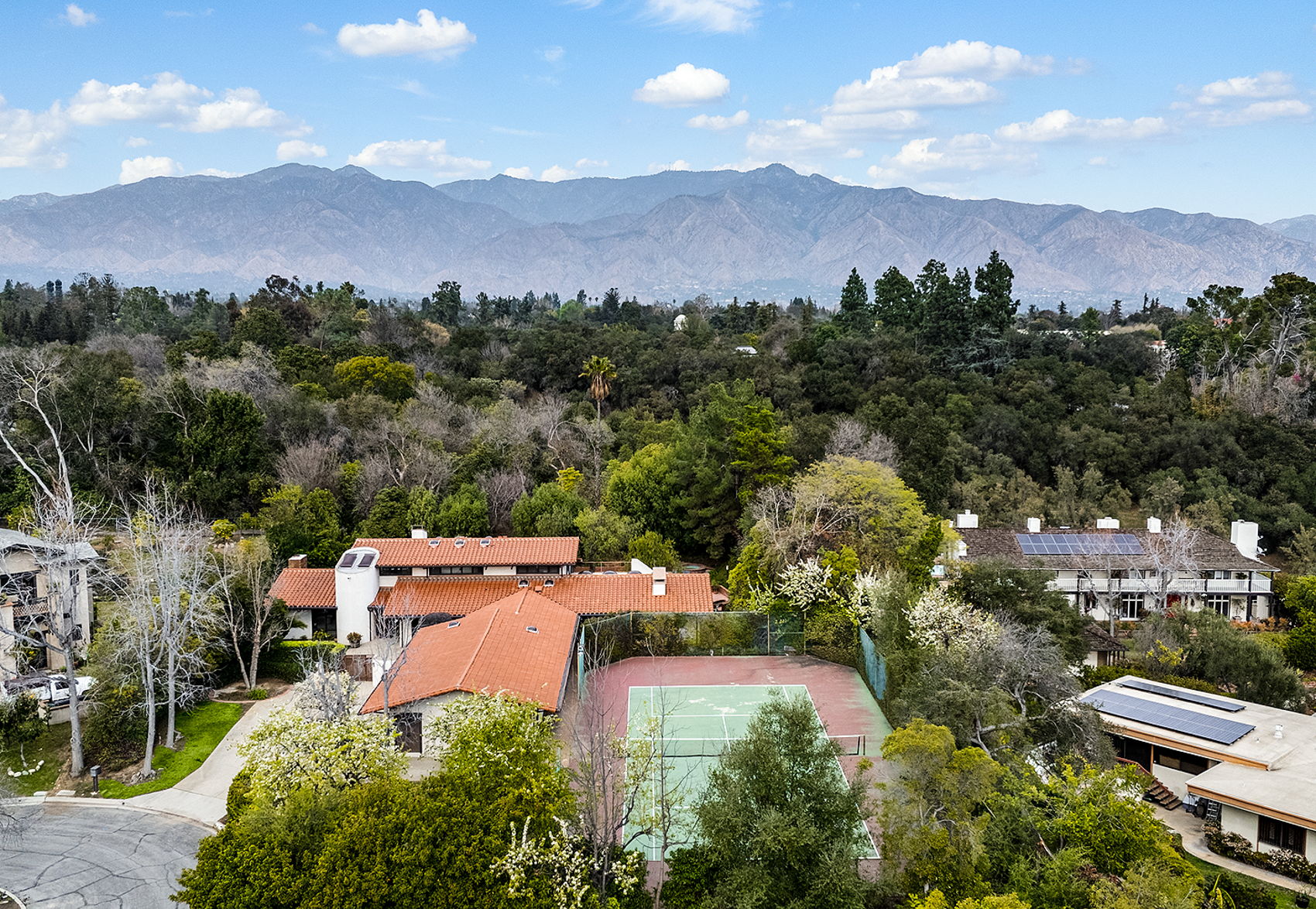 Secluded, private and serene, 1340 Oak View Avenue is a bright Spanish style home in the premier Huntington Library estate area of San Marino on a quiet cul-de-sac. Sited behind gates this special property consists of a spacious 5 bedroom / 5 bath residence with pool and north / south tennis court on ¾ of an acre. The attractive foyer opens on the left to a grand living room with an impressive fireplace, soaring ceiling and an abundance of dramatic windows with garden views; a wet bar is tucked in at the living room foyer landing. The hallway then proceeds on the right to the formal dining room with elegant chandelier and windows overlooking the front courtyard, and then to the attractive Spanish tiled gourmet kitchen with center island, and to a large great room with Spanish tiled fireplace, skylights and wet bar. A one-bedroom suite and two bedrooms that share a bath are adjacent with views of the back garden. Beyond the kitchen are the laundry and a back bedroom and bath. A three-car attached garage completes the first level. Upstairs, the primary suite has an office / library with fireplace, a large primary bedroom and a generous primary bath with a tub, shower and commode flanked by two separate Pulman sink and closet areas. Ideal for entertaining, the exterior offers a patio with fire pit overlooking the pool, a tennis court and lovely mature plantings. Located close to Lake Street shopping, freeways, Polytechnic School, and Caltech, 1340 is wonderful!